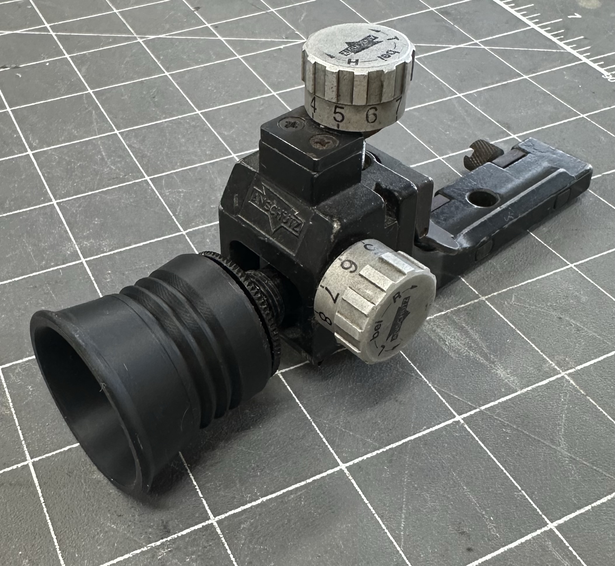 Rubber eye cup. Helps shade the peep disc on rear sight and can provide a reference point for eye distance from the rear sight.